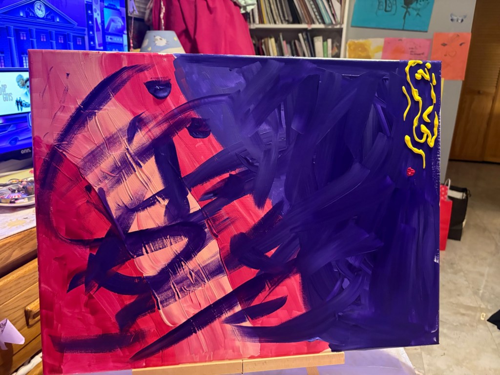 this is my first art piece that felt angry. “the yellow is leaving” that felt like it came from my soul ❤ i stopped wanting it to be perfect and i expressed my self. to me and for me, the purple is not darkness and the pink is how i feel inside. the side where the purple meets the pink is messy. it is how it feels when things are going well and traumatic people in my life creep back in to destroy things and wonder why it leaves me exhausted and angry …. life is messy but it doesn’t have to be abusive. the yellow is the light. the yellow is leaving. 💓💜💕