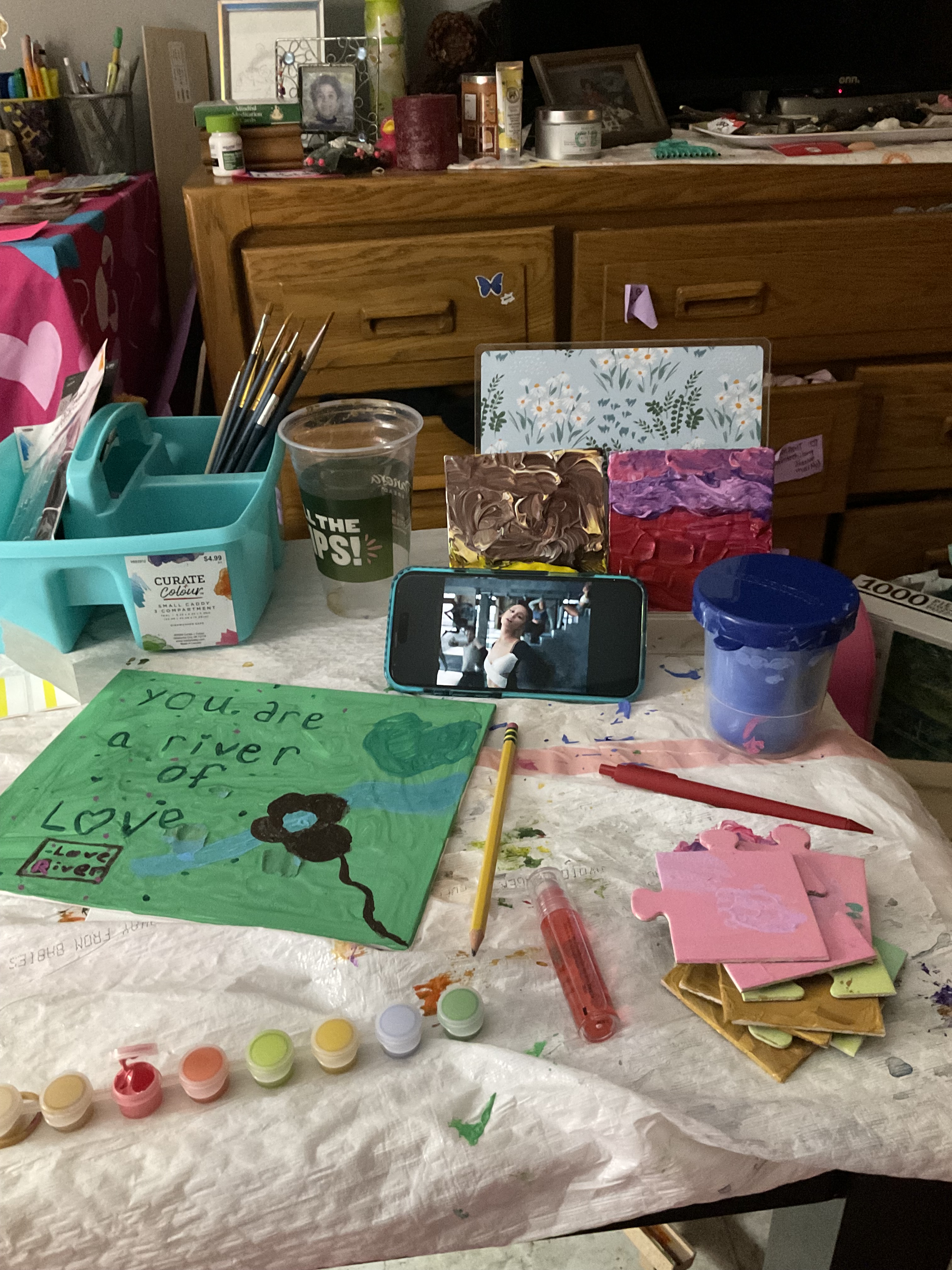 my sweet set up painting 🥺💕i sometimes get overwhelmed with how much art i create and i can’t decide what to do or paint and i get anxious. i am slowing down and putting everything in my portfolio bag and focusing on one painting at a time. they all deserve my love. i’m journal,ing now, too. things that are simple that are bringing me joy!